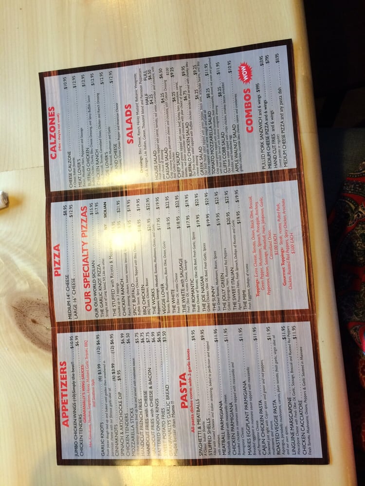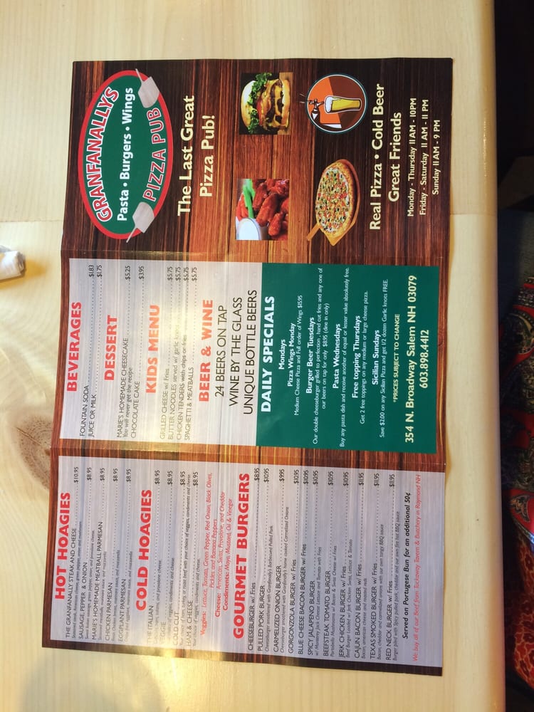 Granfanallys, located in Salem, NH, offers a diverse menu of pizza, burgers, and bar options. With features like delivery, takeout, and outdoor seating, it caters to a wide range of preferences, including vegan and vegetarian options. The restaurant provides a casual ambiance with waiter service, TV screens, and even a pool table for entertainment. Customers praise the fresh, flavorful dishes, such as the garlic knot pizza and Mascarpone Sicilian. The menu includes tempting appetizers like garlic knots, Mozzarella sticks, and chicken tenders, as well as a variety of pizza options from classic cheese to gluten-free choices. The Wednesday special of 75-cent wings is a hit with patrons. Overall, Granfanallys combines great food with a lively atmosphere, making it a top choice for dining out in the area.